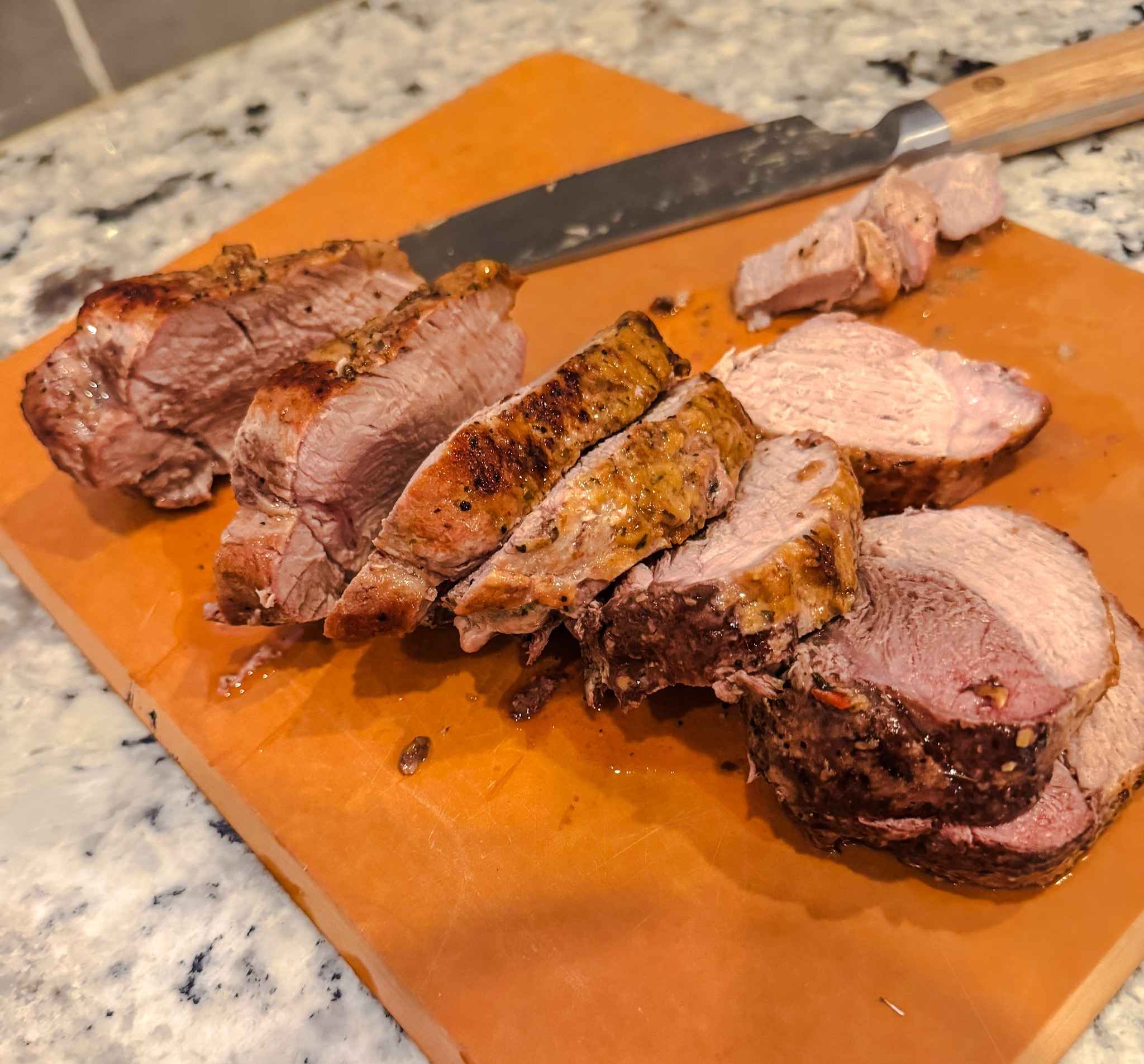 Pork loin cut on a cutting board. A knife is in the background on its side.
