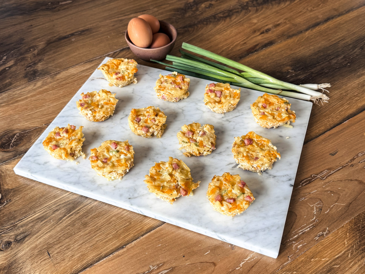 12 breakfast cups on a marble backdrop on a wood surface. Eggs and green onions to the top left.