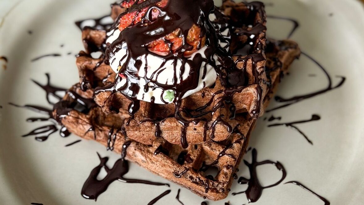 These chocolate Greek yogurt waffles are thick, fluffy, and taste like dessert for breakfast — made with cocoa powder, einkorn flour, and Greek yogurt for a waffle that actually fills you up.
