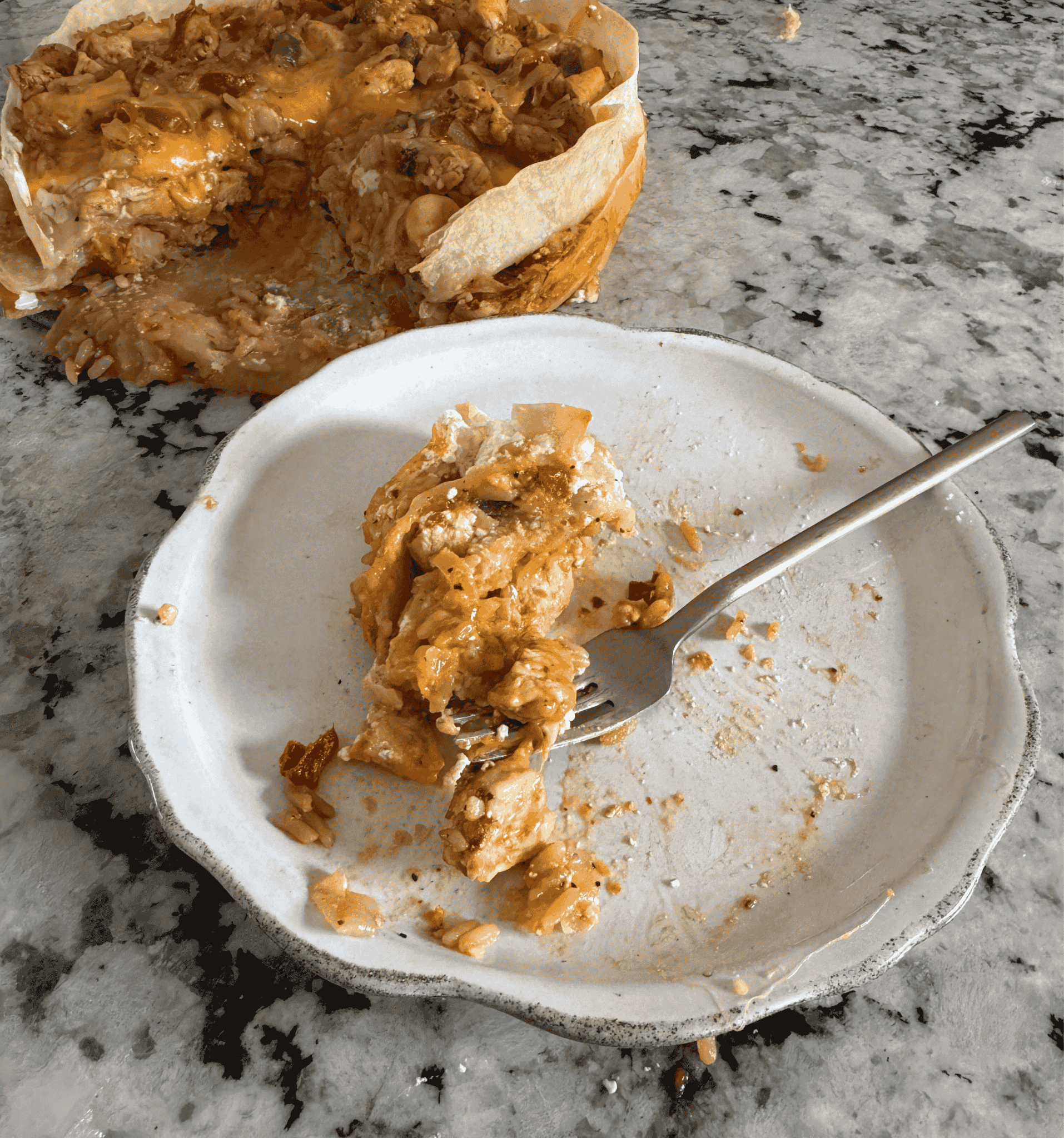 • Place 1 of the 3 large tortillas on the bottom. Spread 2 tbsp. of sour cream onto the tortilla. Sprinkle 1/3 Scoop 1/3 of the chicken mixture on top and spread it out, followed my 1/3 of the rice. Sprinkle on 1/3 of the sharp cheddar cheese and continue this all the way to the top.