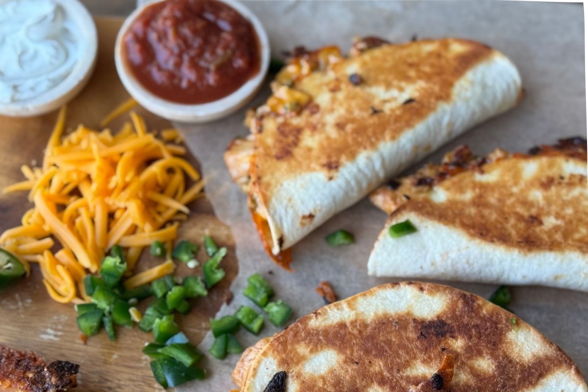 These tacos have that creamy, cheesy, slightly spicy filling we love — real cream cheese, sharp cheddar, smoky bacon, and fresh jalapeños — but with seasoned organic chicken folded in so it’s filling. Everything gets tucked into tortillas and baked until golden and crisp. The edges crunch, the inside stays creamy, and it gives us the jalapeno dip flavor we crave, with a lot more protein.